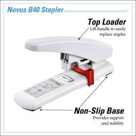 The Novus B40 Heavy Duty stapler is designed for high-volume stapling of up to 100 sheets with minimal effort. It features anti-blocking to prevent jams, a dual staple guide for superior performance, and a bypass system for using longer staples on fewer sheets. It's German engineered with an adjustable depth guide to ensure your clinch is always at the right spot and angle. This stapler works flawlessly when paired with Novus 23 gauge premium staples.