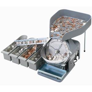 Pour a large quantity of mixed coins into the tray. Turn 'ON' the SE. Feed the mixed coins from the tray into the hopper. They will be rapidly separated into the individual removable coin boxes.