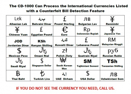 - One Pocket Multi-currency Counter and Sorter with Counterfeit (CF) detection for U.S. Dollars (USD), Euros (EUR) and other international currencies