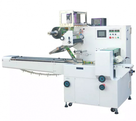 Flow wrapping machine that makes a three-sealing pillow pack, with rotary motion end sealing for high-speed running, can be equipped with different level control systems to suit various packaging requirements.
