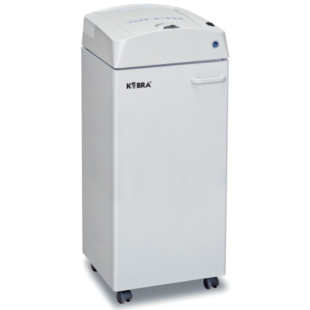 Equipped with an exclusive Oil-free System, a continuous duty motor without overheating and carbon hardened steel cutting knives. The patented Energy Smart System turns in power-saving stand-by mode just after 12 seconds of non-operation. Kobra AF+1 with a shredding speed of 17 sheets per minute and a 22-gallon cabinet mounted on casters is recommended for medium-sized offices.