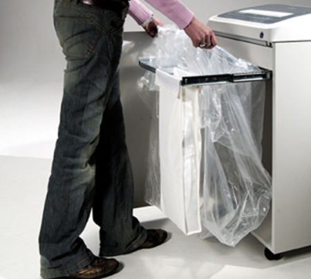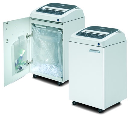 Equipped with: Integrated Automatic Oiling System, EPC (Electronic Power Control) to optimize shredding without jams, Energy Smart System, and automatic disconnection from the mains for maximum power saving, Automatic Start&Stop, Safety Stop at door opening and/or full waste bag, Automatic Reverse in case of jamming. 40-gallon high-volume cabinet mounted on casters.
