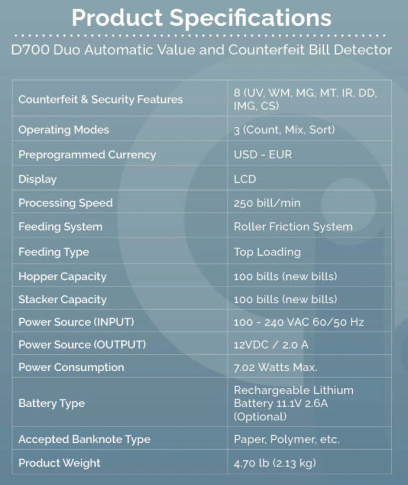 The D700 | Duo Automatic Value and Counterfeit Bill Detector is the perfect solution for high-capacity counterfeit detection with 8 counterfeit and security features. The D700 Duo safeguards your hard-earned cash from threats while providing mixed value counting for USD & EURIts easy-to-use LCD screen and audiovisual notifications make this an intuitive and user-friendly model. Not to mention, its multi-directional/multi-orientation feature allows you to insert bills in any direction.