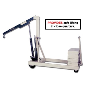 • Each crane is proof loaded at 150% of its rated capacity to insure integrity and is equipped with a safety valve to prevent dangerous overloading. Hydraulic lift is controlled by a hand pump and precision lowering is regulated by a needle valve. All cranes are shipped complete with extension boom, safety swivel hook, counterweights, steering handle and roller bearing phenolic wheels. Exceeds ASME PALD-12 and ANSI Z535 standards. Optional wheels, floor lock and power lift option featuring deep cycle battery -- fully automatic charger plus a remote pendant on 20' coil cord available