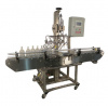 Pressure overflow micro filling machine. Containers enter the filling area in groups. When the last container in the group passes the mounted counting sensor, a pneumatic gate will engage and prevent other containers from interfering in the filling process. A product aligner engages the necks of each container, centering it under each fill nozzle, and the nozzles will lower into the opening of each container.
