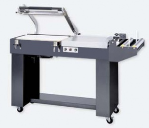 Standard Series: Semi automatic L-Sealer with magnet clamping, powered takeaway conveyor, cylinder arm return, Teflon coated ceramic groove beads, stainless steel compensatory assembly, automatic cycle timing, pin perf, film clamps, casters.